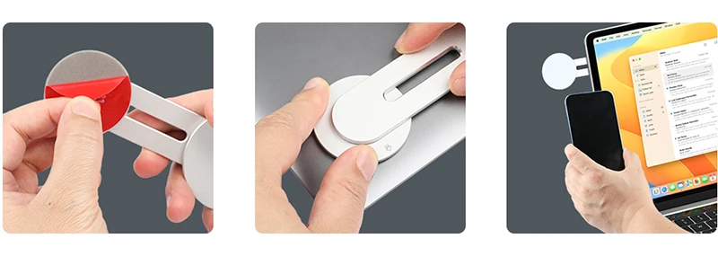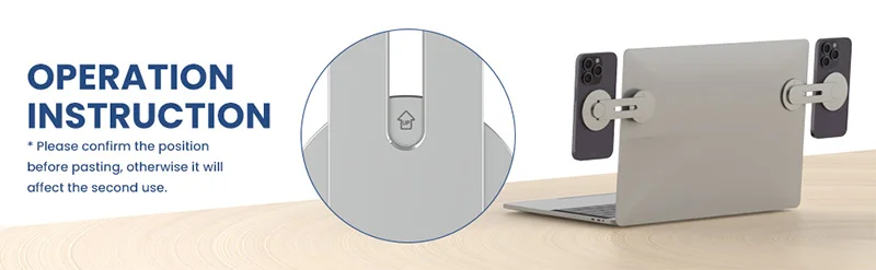 Just tear the adhesive, look for the "UP" sign on the phone stand, and place it on the edge of your laptop or other flat panel display. Then rotate the holder to the right position and place the phone on it to use, stable and not loose.
